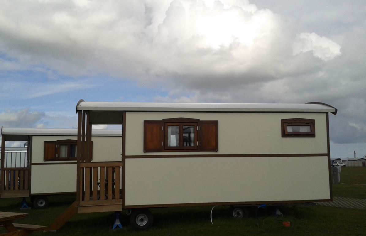 Neben den Pipowagen bietet der Campingplatz noch zwei blaue Nordseekarren als Mietunterkünfte an. Die Ausstattungen sind vergleichbar mit denen der Zirkuswagen, allerdings ohne zusätzliche Toilette.