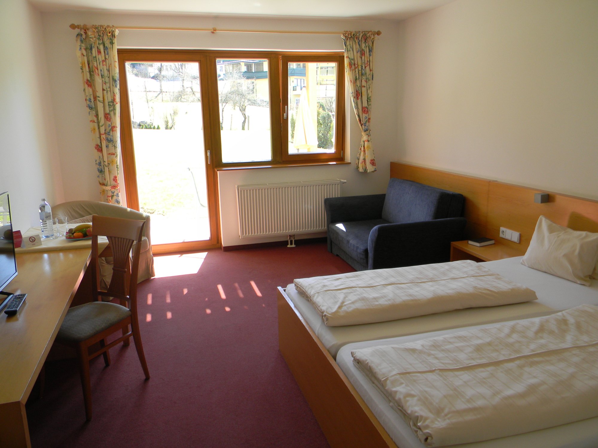 Nach einer freundlichen Begrüßung an der Rezeption können wir unser Zimmer im Erdgeschoss des Haupthauses beziehen. Auf dem Weg dorthin fällt mir gleich ein sauberer Babywickelraum und ein nette Spielzimmer mit allerlei Kinderspielzeug positiv auf.