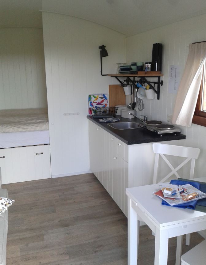 Im hinteren Teil des Wohnraums befindet sich die gemütliche kleine Schlafkoje für zwei Personen, direkt nebenan die eigene Toilette mit WC und Waschbecken. Nur eine Dusche bietet die Unterkunft nicht. Geheizt wird mit einem fest installierten Elektro-Ofen. Die helle Holzeinrichtung ist hochwertig und, passend zur Küste, mit maritimen Details dekoriert. Handtücher und Bettwäsche werden bereitgestellt.