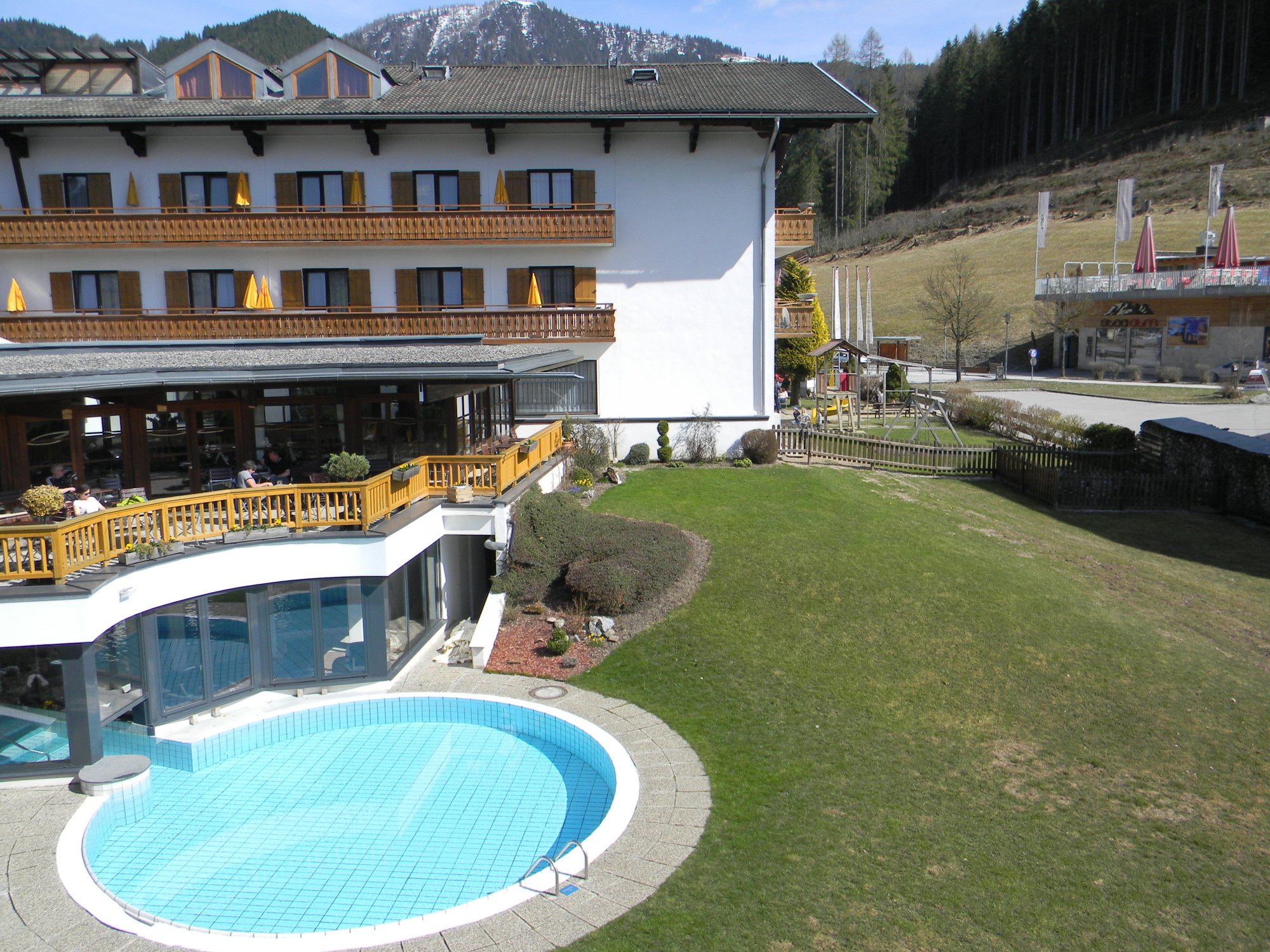 Der gesamte Hotelkomplex, der aus mehreren Häusern und Anbauten besteht, ist untereinander verbunden und bietet kurze Wege für die Gäste. Nur fehlen Aufzüge in den Gebäuden, was sich beim Tragen der Koffer und Sportausrüstung bemerkbar macht.