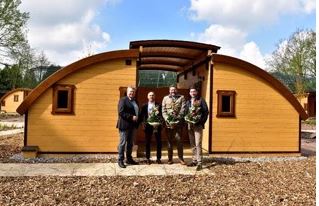 Günter Springer (l.), Inhaber und Gründer von Naturwagen & Lodges, übergibt die neuen Camping-Pods an die Serengeti-Park-Geschäftsführer Dr. Fabrizio und Giovanni Sepe, sowie den Ressortleiter Übernachtungen, Jens Asche
