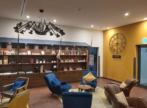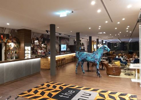 Die Rezeption und die Lobby sind gemütlich und vor Allem bunt. Direkt am Eingang begrüßt uns ein stylisches blau-lila Pferdemodell und rustikale Möbel, die an die Idylle eines Reiterhofes erinnern. Die einzelnen Bereiche, Empfang, Sitzecken und Speisebereich, sind offen gestaltet und gehen stimmig ineinander über. Überall findet man kleine Tische und Hocker, an denen auch Arbeiten Spaß macht. Dafür sorgen ausreichend Steckdosen und kostenloses W-Lan.